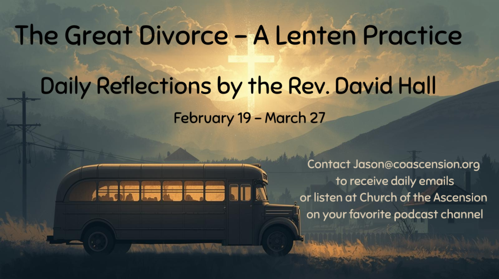 C.S. Lewis’ The Great Divorce is an excellent tool for understanding our relationship with God and all the things that can get in the way. From February 19 – March 27, David+ will explore the concepts of Heaven and Hell on a bus ride to the Pearly Gates.